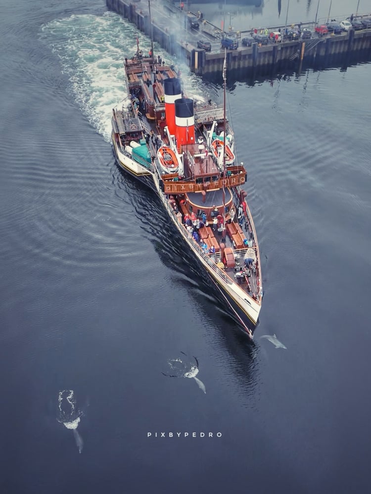 Leaving Largs - the Waverley under escort from a pod of dolphins. A4 print, mounted and framed